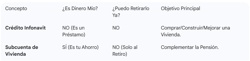 Infografía comparando la Subcuenta de Vivienda (tu ahorro, dinero que se puede retirar al jubilarse) y el Crédito Infonavit (un préstamo para casa, no retirable en efectivo).